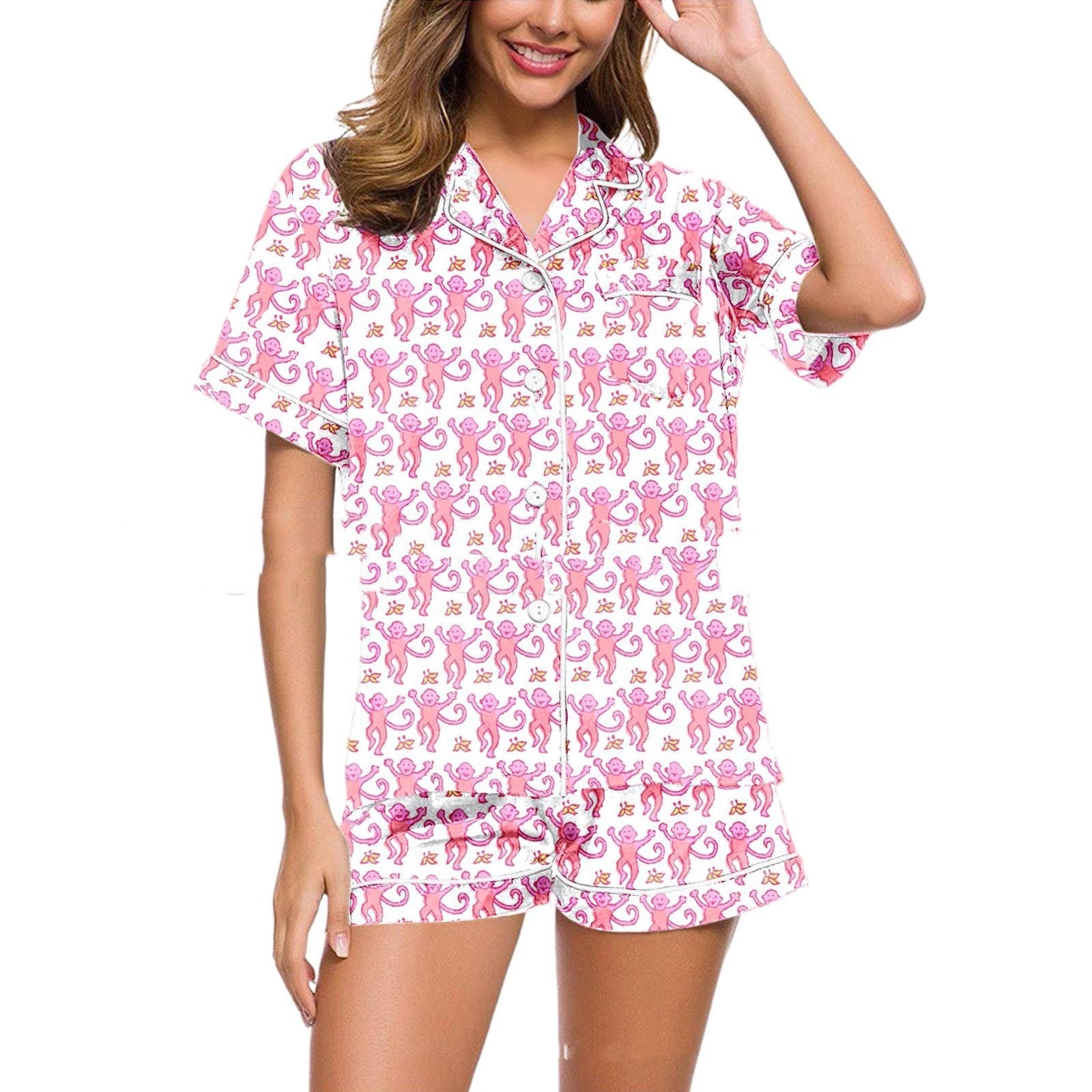 Sweet monkey pajamas with a button-down top and short sleeves with elastic waist shorts. Breathable, comfortable, cool, casual great for spring and summer. Plus sizes available.